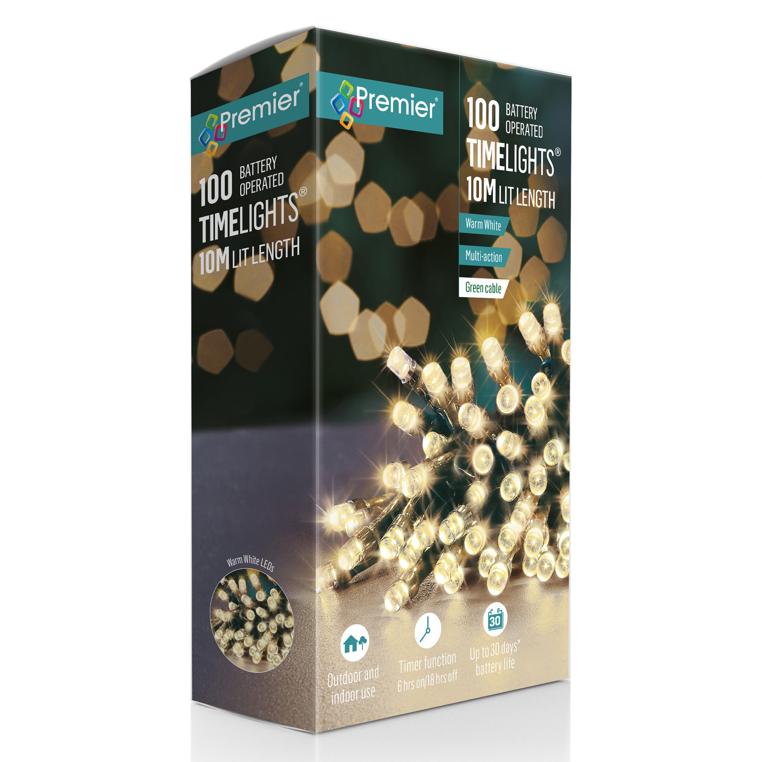 Elevate your festive display with the 100 Battery Outdoor Timelights Warm White. This design features a beautiful light effect that adds warmth and sparkle to any room, window or display area. Perfect for creating a welcoming seasonal atmosphere, it works beautifully on its own or paired with other pieces from our collection.